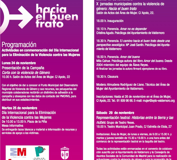 El próximo jueves 27 de Noviembre estaré, a las 18:50 en el Ayuntamiento de Valdemoro participando en las X Jornadas contra la Violencia de Género, hablando del Amor del Bueno. Y, al finalizar, también firmaré libros para quienes lo deseen.