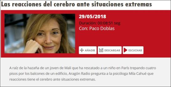 Si alguna vez te has encontrado en una situación extrema, es posible que te haya sorprendido hasta tu propia actuación, en un sentido o en otro. Aquí hablamos de un vídeo que se hizo viral, de un chico que literalmente trepó cuatro pisos para rescatar a un menor. ¿Qué ocurrió para que actuara así? De ello hablamos en este programa de Aquí la Radio, para Aragón radio, el pasado 29 de Mayo de 2018. Espero que os guste.