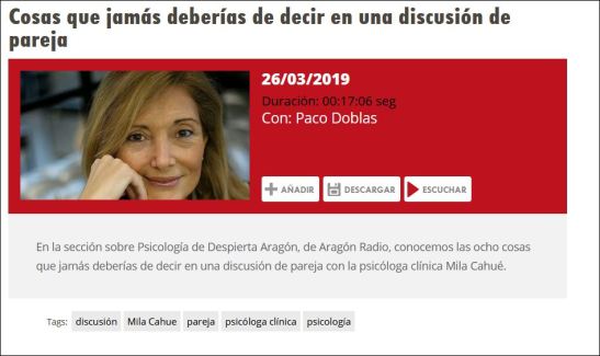 «Cariño, tenemos que hablar», «Que no quiero discutir», «Te pareces a tu madre», y un largo etcétera de frases y algunos reproches que, lejos de facilitar las conversaciones en pareja, hacen saltar las alertas y ponerse a la defensiva ante una posible situación incómoda. Pero, ¿es realmente tan difícil ajustarse en pareja? Recordad que hablamos para resolver, no para buscar culpables y, mucho menos, para ofender. Las parejas más felices no son las que menos problemas tienen, sino las que mejor los resuelven. De todo ellos hablamos con Paco Doblas en el programa Aquí la Radio, de Aragón Radio, el pasado 26 de Marzo de 2019. Espero que os guste.